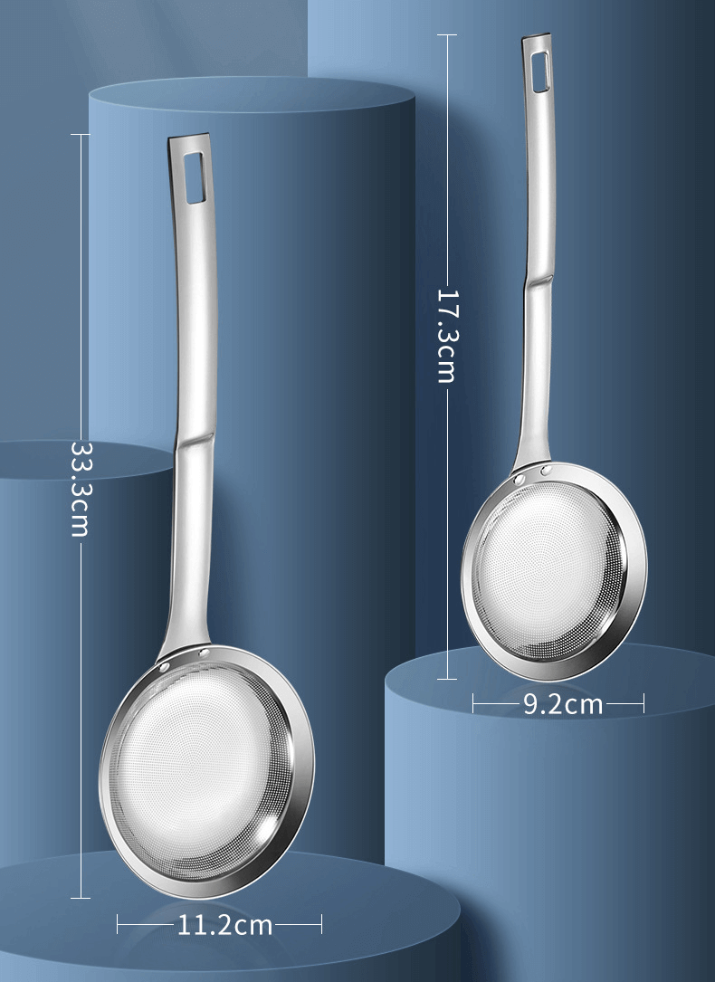 It is made of 304 stainless steel. It is resistant to oxidation and will not rust and is durable. It has a fine mesh so that it can filter all kinds of residues. Easy to clean and easy to store. Material: 304 stainless steel; Size: S 17.3*9.2cm / L 33.3*11.2cm.