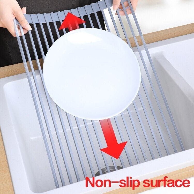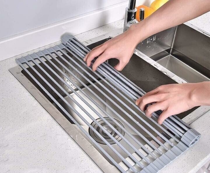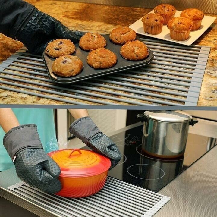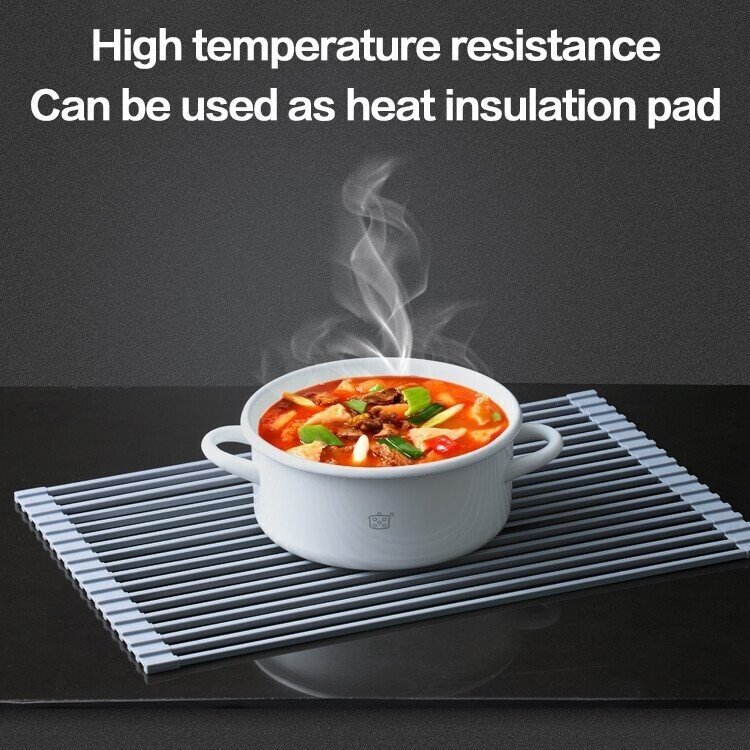 strong load-bearing capacity; good heat insulation; can be used in a variety of scenarios: Can be used to make desserts, You can also use it when baking things; fits perfectly any kitchen and design: Its foldable structure allows you to roll it up and put it away in a drawer or cupboard when not in use. Easy to clean + (Dishwasher safe). Also perfect for camping, picnic, and other outdoor activities. SAFE: Environmental and food-grade silicone material, non-slip, rust-resistant, and BPA-free. Item Dimensions M:14.6*9 inches, L:18.5*9 inches. PACKAGE INCLUDE: 1 x Roll Up Sink Rack.