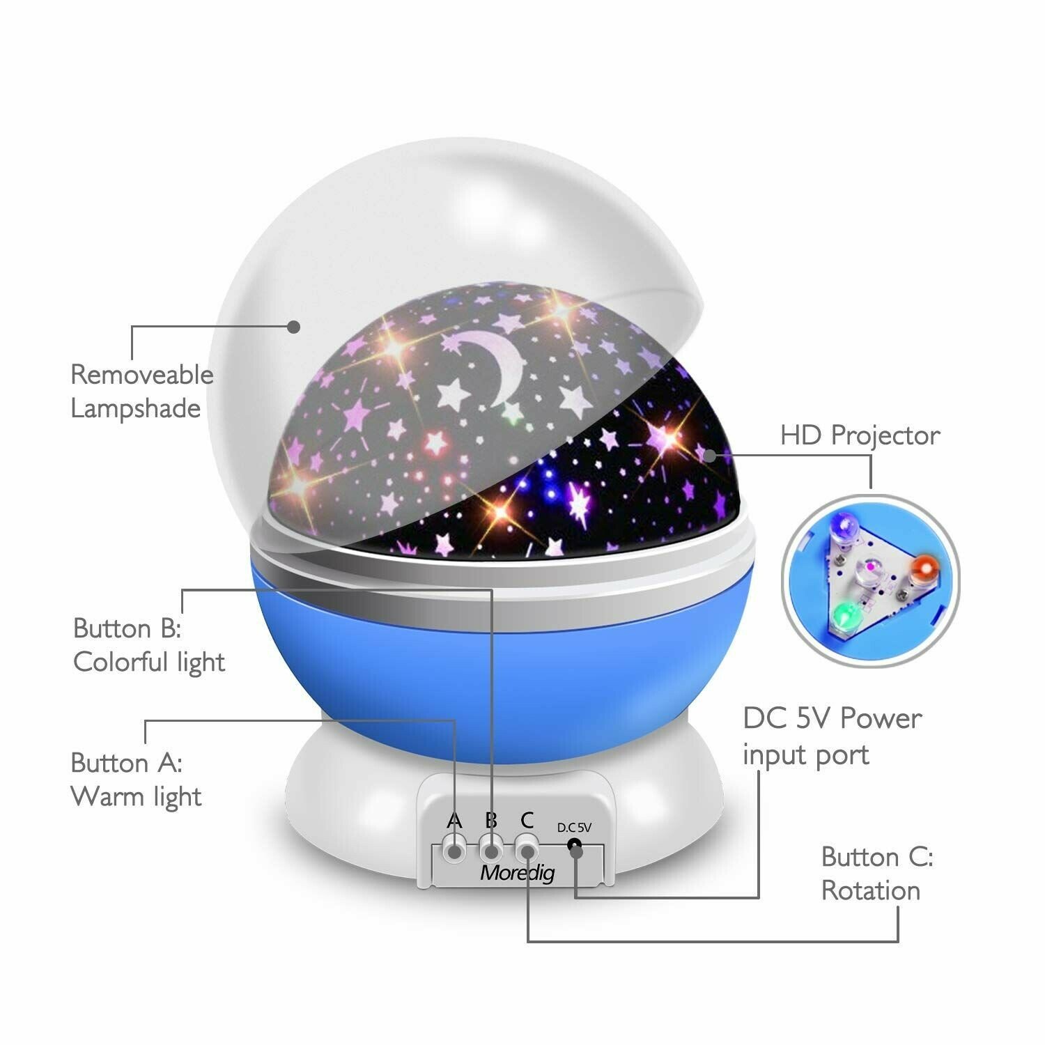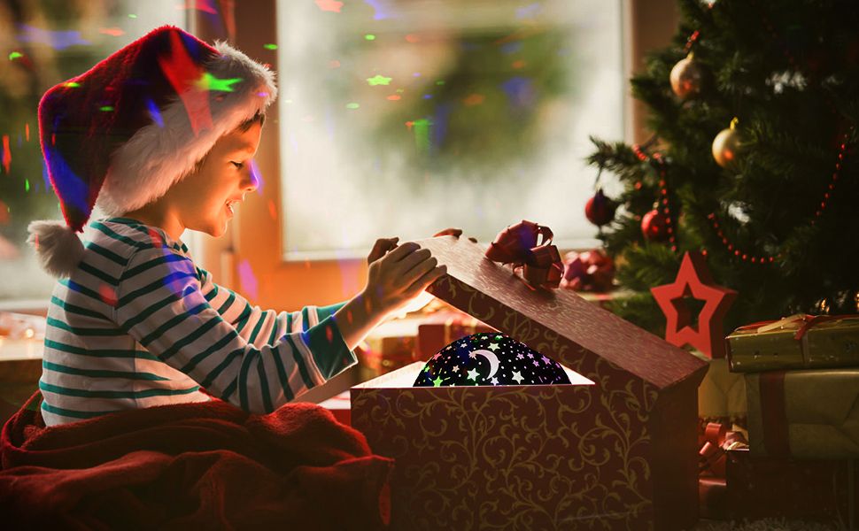 2 Functions: It is not only a night light for babies, but also a star light rotating projector for decoration. Easy Operation: Easily change the light colors or work modes with only 3 buttons. No complicate operation, easy to control. Promote Sleeping: Warm and romantic lights accompany babies to sleep, they will never be afraid of darkness. Perfect Gift: It is an ideal birthday and Christmas gift for your girls and kids, do not hesitate anymore, buy it and give them a surprise. 1 x The Star and Moon Starlight Projector Night Light Bedside Lamp; 1 x USB cable to power up the lamp. (Batteries are NOT included). Please take off the plastic white dome to get projection. Please not use the USB cable and batteries at the same time. LEDs are the super bright, please do not look directly into the lights to avoid damaging the eyes.